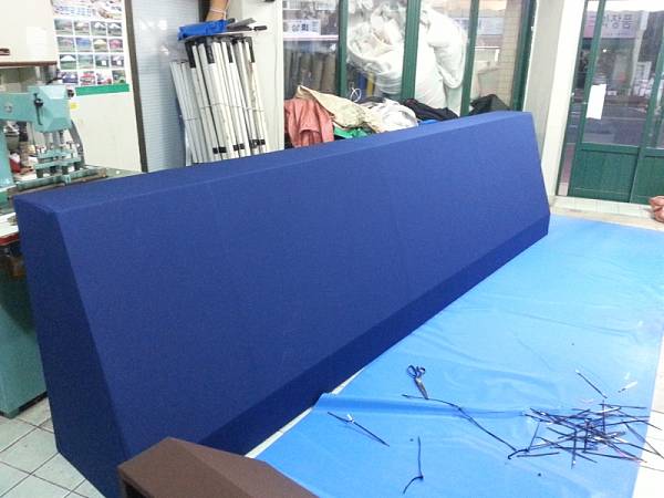 2.제작된 각파이프 골조에 재봉작업마친 원단을 씌웁니다.