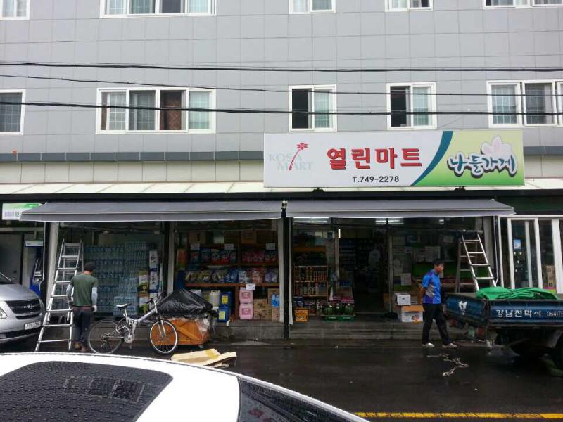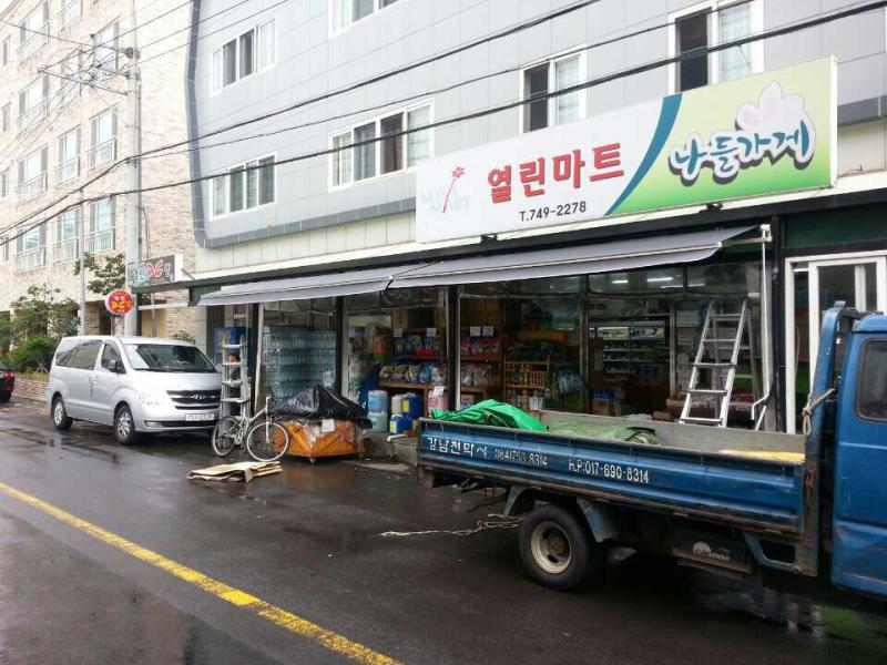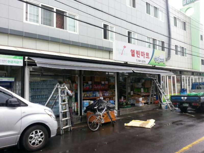 마트앞이라 진열상품등의 비가림및 해가림을 위해 설치하였습니다.
