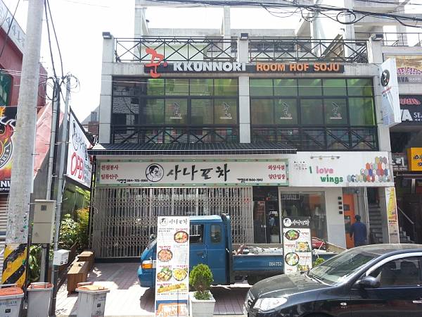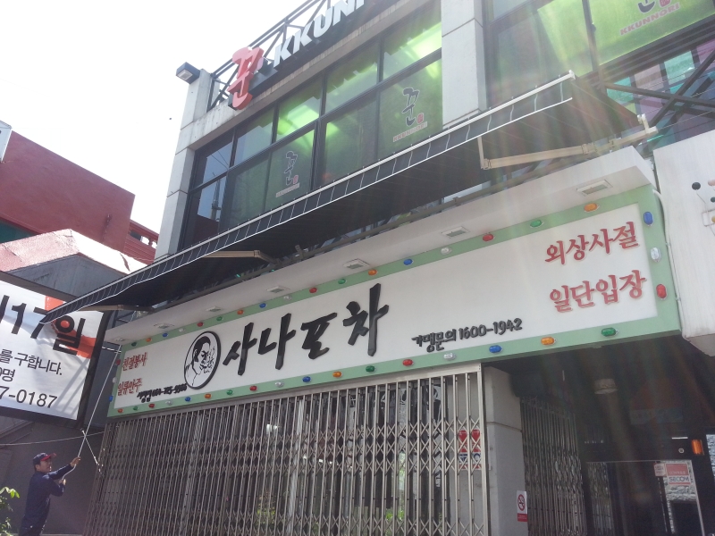 기존의 어닝설치시와는 다르게 간판위쪽에 수동어닝을 설치했습니다.