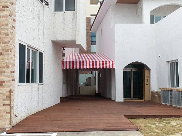 기존의건물과 신축건물 사이에서 떨어지는 비를가리기위해 설치했습니다.